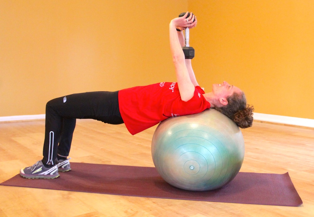 This is an easy go-to exercise for upper body strengthening. It is multi-tasking and challenges core and hip stability. The main objective is creating strength and mobility with shoulders and arms while maintaining stable hips and torso on the stability ball.