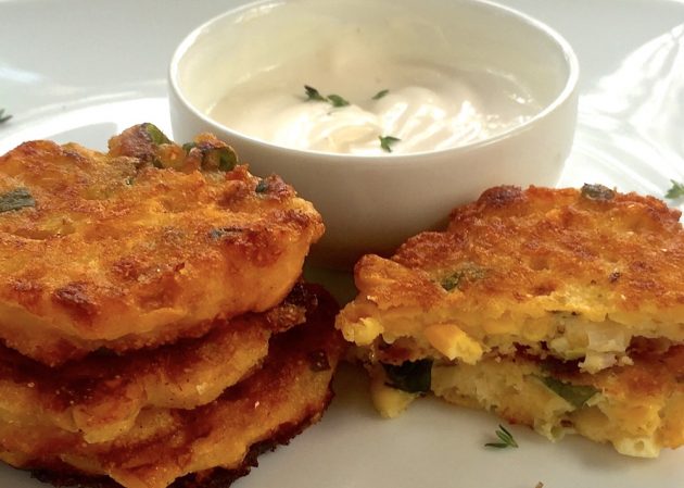 These corn cakes are very easy to prepare, and they can be eaten at any time of the day. They taste great on their own for breakfast with a little maple syrup, but they also work well at dinnertime as a side. These corn cakes can even be used as an appetizer by garnishing them with sour cream and chives. As with most recipes, there is plenty of room to play a bit with the flavors here too. You can add some finely chopped jalapeno for spice or a handful of your favorite cheese to enhance the flavor. The recipe makes about 16-20 corn cakes.